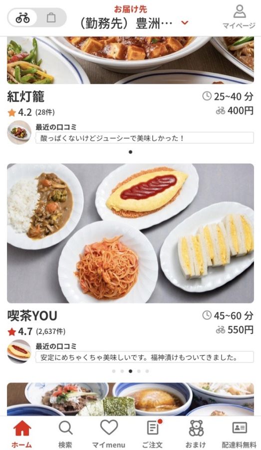 オーダーの手順は簡単。まずはアプリを開くとオーダー可能なお店が一覧で表示されます。どれも美味しそうで悩んでしまいますね。各店舗には配達までの時間の目安や口コミなども表示されているので、お店選びの参考にしてみてくださいね。