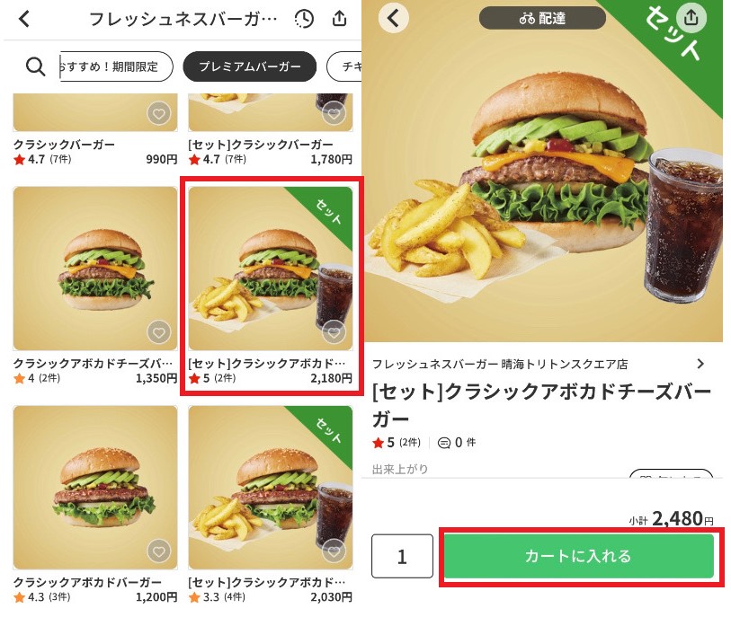 フードやドリンクなど、注文したいものを選んでカートに入れましょう。