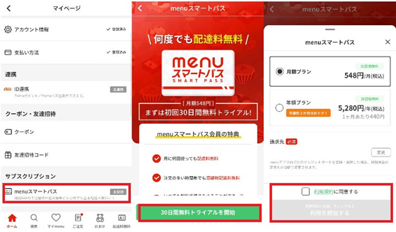 まずはmenuアプリの右上にある「マイページ」を開きます。「サブスクリプション」の項目内にある「menuスマートパス」をタップ。30日無料トライアルを実施しているので「30日間無料トライアルを開始」をタップし、「利用を開始する」を選択すれば加入完了です。あとは通常のようにオーダーをすればOK。