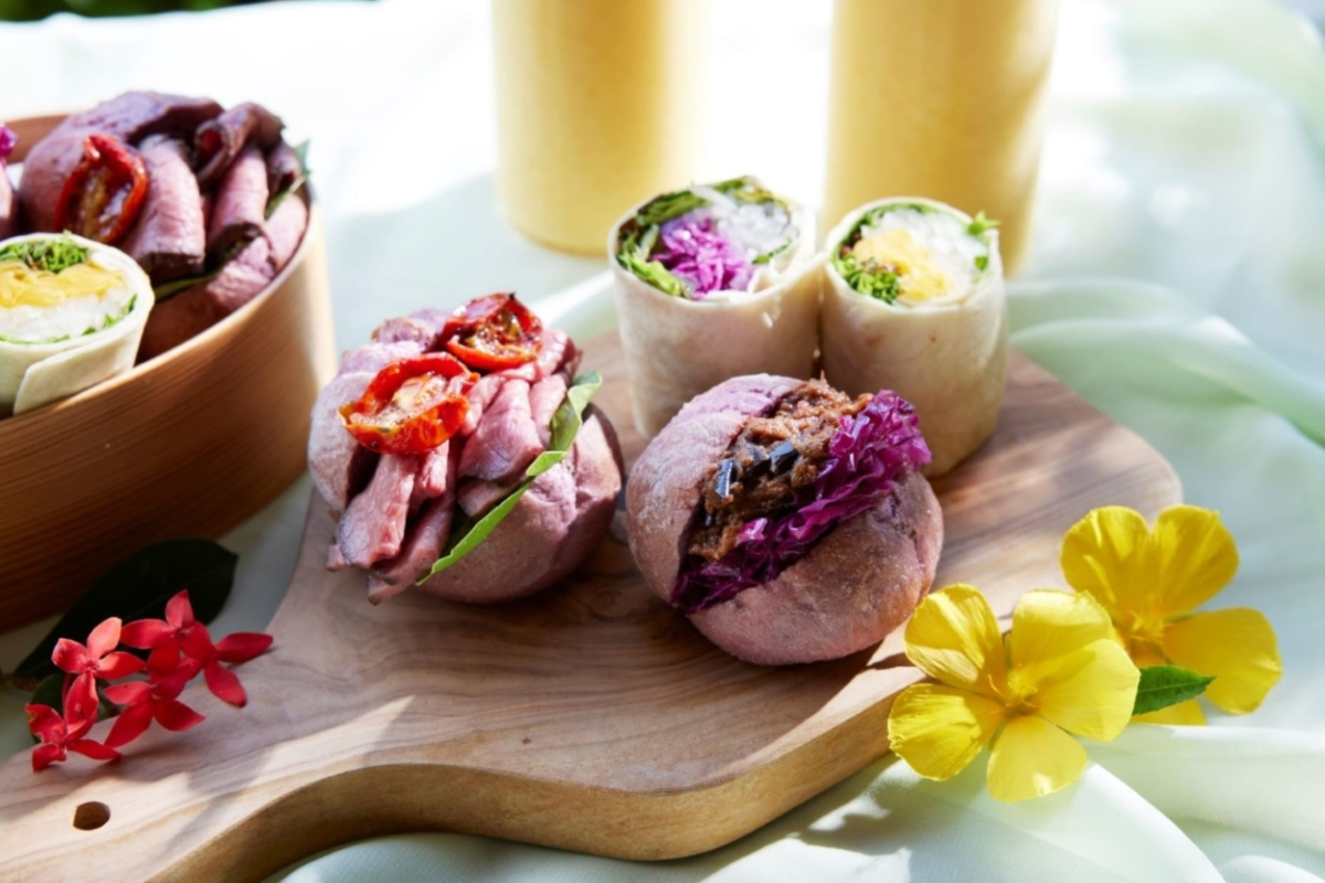 リュウキュウアカショウビンの赤をイメージしたパンのサンドイッチやパインとゴーヤのスムージーなど色鮮やかな朝食をいただきます。