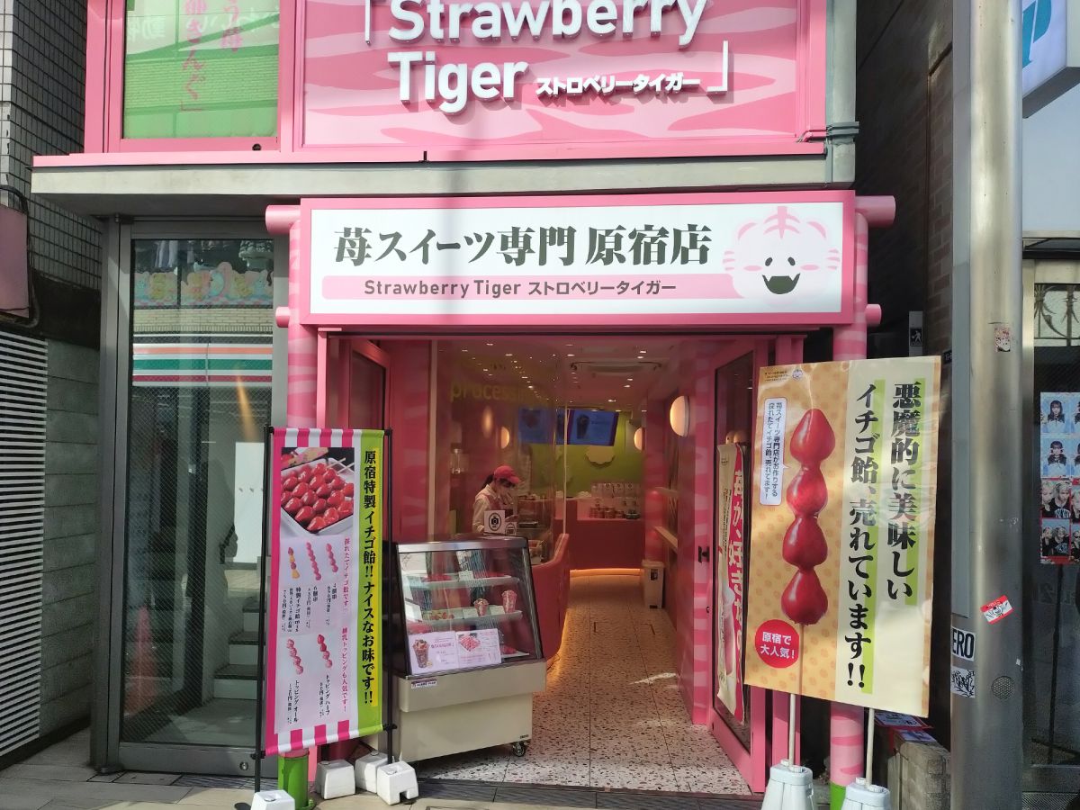 JR原宿駅竹下口から徒歩約4分の場所にある「苺スイーツ専門店『Strawberry Tiger』原宿竹下通り店(いちごすいーつせんもんてん すとろべりー たいがー はらじゅくたけしたどおりてん)」。