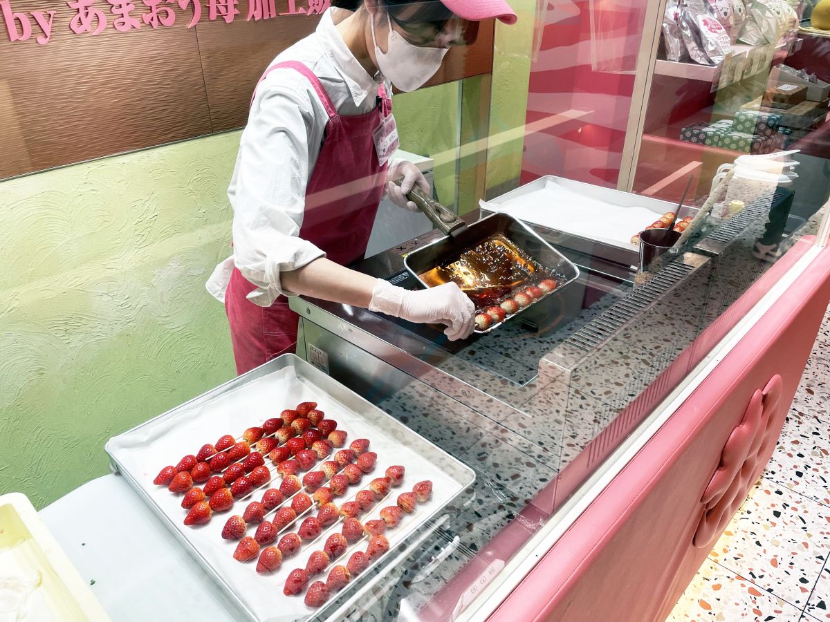 オープンキッチンなので、目の前でいちご飴の仕込みや飴付け作業などが見学できるのもうれしいポイント。
