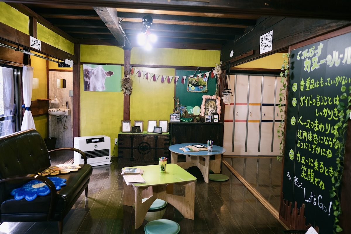 今回お世話になる、「ぐりーんぴーす」さんに到着しました。古民家をベースにした建物で、愛らしい手書きのイラストが目を惹きます。