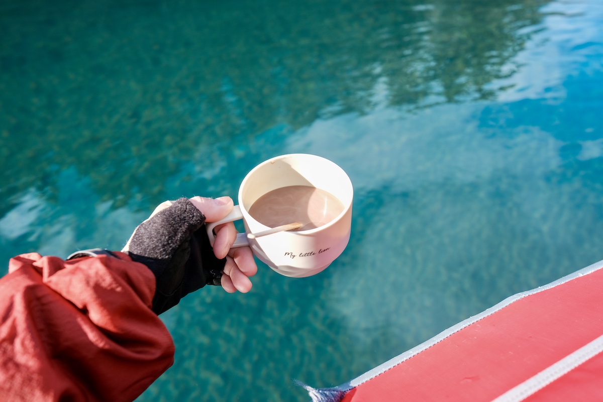 冬の湖上で飲むココアは格別です! おいしい! 体も温まります。
