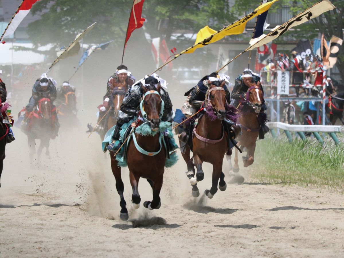 福島随一の祭りで、国指定重要無形民俗文化財「相馬野馬追」は、相馬地方で3日間にわたって行われる伝統行事です。約400騎の甲冑をまとった騎馬武者が腰に太刀、背には旗指物(はたさしもの)を携えて野原を疾走する様子は、まるでタイムスリップしたかのような光景! 約3kmに渡る行列や、甲冑競馬、神旗争奪戦などみどころ満載です。