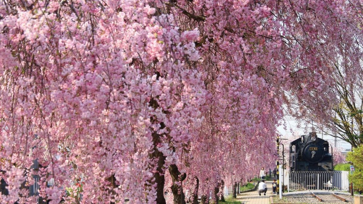 さらに春爛漫の並木道には、かつて日中線を走っていたSLの展示も! 県内屈指の壮大な桜とSLがコラボする絶好の撮影スポットです。見ごろを迎える4月頃には、市内のお店で桜にちなんだ期間限定メニューの提供もあるそう。