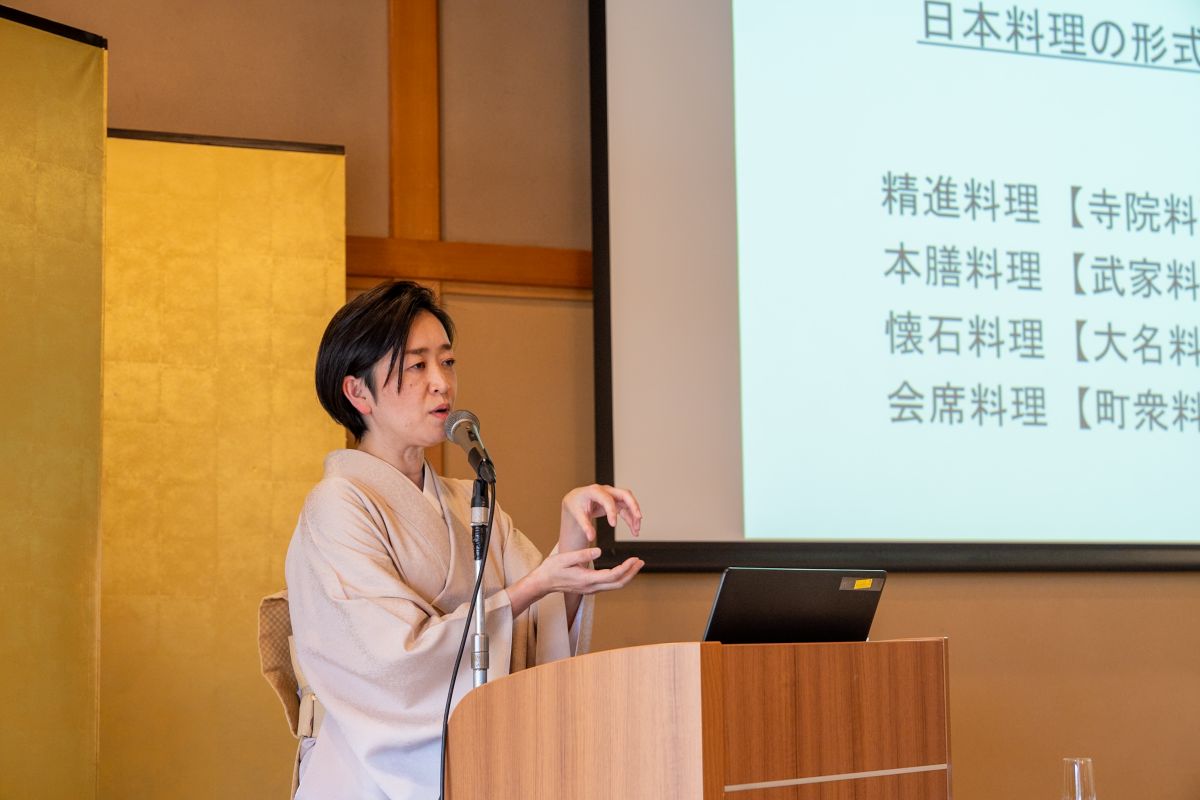 早速講座がスタート。そもそも日本料理には大きく分けて4つの形式があるといいます。お葬式や法事などに提供され、肉や魚、ニンニクやネギといった香りの強い食材を使用しない精進料理(寺院料理)、大河ドラマなどで見られるようなひとつずつ足のついた膳で提供される本膳料理(武家料理)、お茶を点てる際に胃に負担がかからないよういただく懐石料理(大名料理)、前菜、先付などからスタートし、最後にご飯やお味噌汁が提供される会席料理(町衆料理)の4つ。最も私たちがなじみのある会席料理(町衆料理)は江戸時代中期ごろに完成したと言われており、おもにお酒と食事を一緒に楽しむためにこのような形式になったのだといいます。