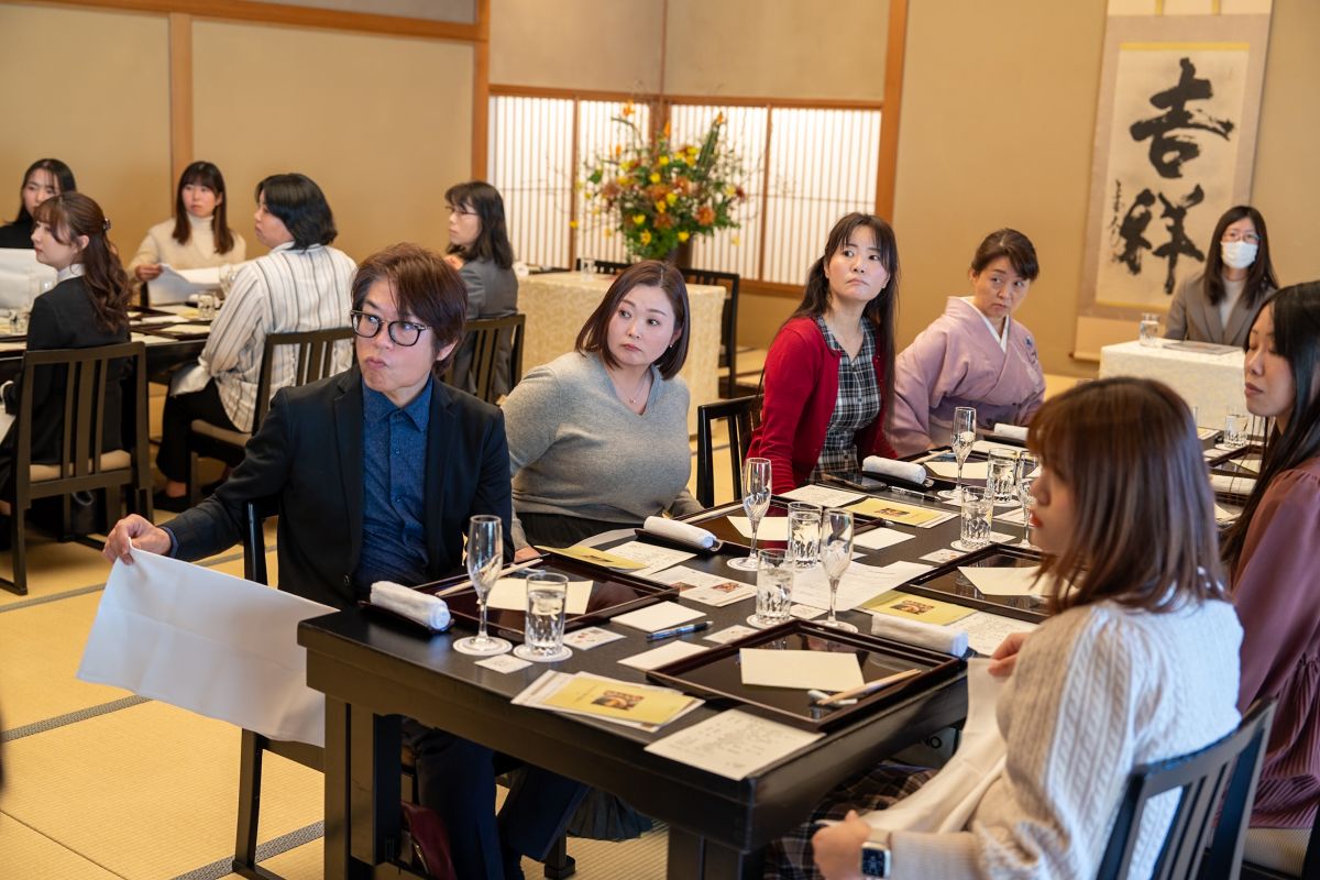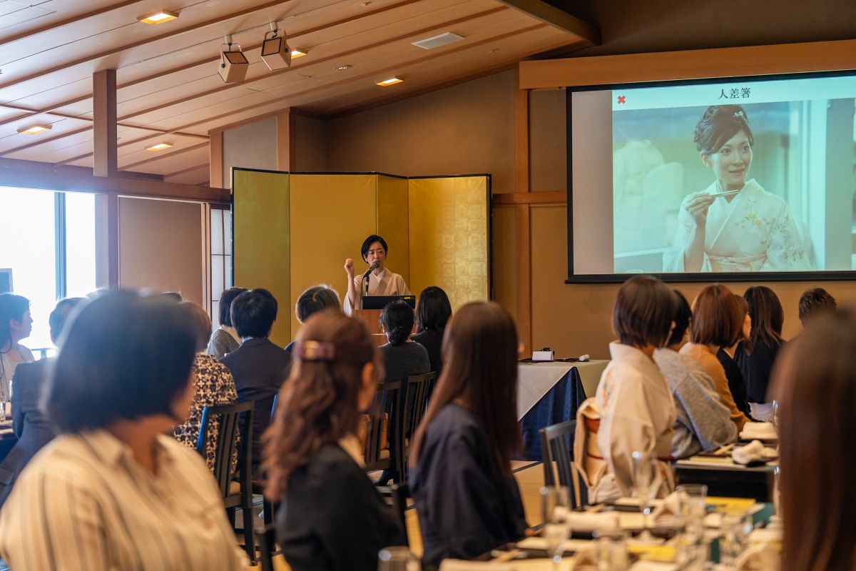 今回講師を務めたのは、料亭「錦水」女将の新盛睦美さん。2017年に「錦水」の女将に就任し、財団法人 日本ホテル・レストランサービス技能協会 日本料理食卓作法認定講師でもあります。今回は新盛さんによるテーブルマナー講座に加えて、実際に「錦水」の会席料理をいただきながらマナーを実践するという内容になっています。