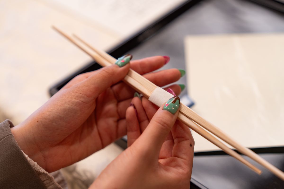 和食で重要な箸にも多くのルールがあります。例えば、取り分ける時に箸の反対側を使ってしまいがちですが、これはNG。箸の反対側は神様が食べるものという考え方があるのだといいます。ほかにも、「刺し箸」や「舐り箸」、箸を持った右手で器を取る「ずぼら箸」など、食事中のマナーがたくさんありますが、特に悩むのは食べる前に箸についている帯をどう取るか、ではないでしょうか。固くて外れない…というときは、右手の親指で帯の端を持ち、帯を中心に奥側の箸を右手で、手前の箸を左手で持つようにして左右に動かすようにするのがコツ。そのほかの箸のマナーについても、参加された方々は熱心に話を聞き実践していました。