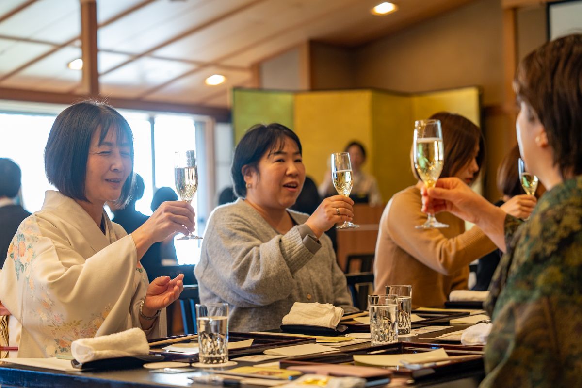 講座のあとは、いよいよお待ちかねの会席料理の登場。まずはノンアルコールスパークリングワインで乾杯!といきたいところですが、ここで注意すべきはグラスとグラスをカチンと合わせないこと。会席料理など正式な場での食事の場合は、グラスを目線の高さまで上げて、同席している方の目を見てニコッと微笑むのがスマートです。