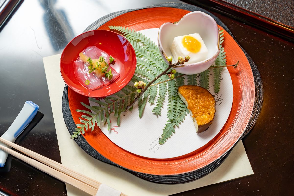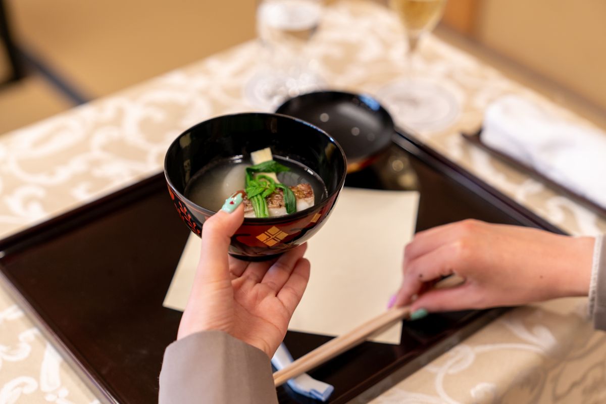 京都の愛宕山麓の水を使用したお吸い物も絶品。優しいだしが胃に染み渡るのがよくわかります。お椀を食べるときに先に箸を手に取ってしまいがちですが、必ずおまず椀を持ち上げてから、お箸を持つという順番が美しい作法です。