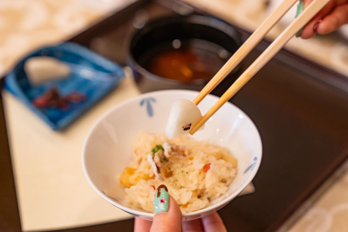 食事は先ほどの前菜と同様、左手前、右手前、奥の順番でいただきます。このときもまずお椀を持ち上げてからお箸、ひと口いただいたらお箸を置いてからお椀を置く、という順番で次のお椀へ進みます。この順番に手こずる参加者もいたようで、筆者も食べながら少し混乱しそうになってしまいました……。ちなみに一番奥にある漬物を取るとき、手前にあるご飯や味噌汁を越えて手を伸ばすことは和食のマナーとして避けたいところ。この場合はご飯のお椀を持ったまま、お漬物を取って食べるのが美しい所作になるのだそう。すぐには慣れない動作かもしれませんが、毎日少しずつ意識して身につけていきたいですね!