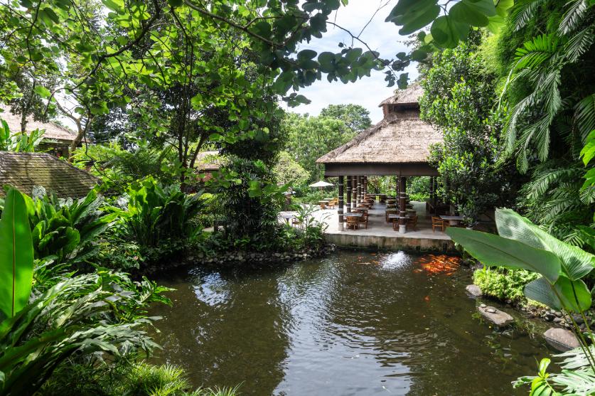 朝は敷地内にある「クミリ」で朝食を。アランアランの屋根が美しいオープンエアのレストランです。目の前には池があり、鯉も気持ちよさそうに泳いでいます。
