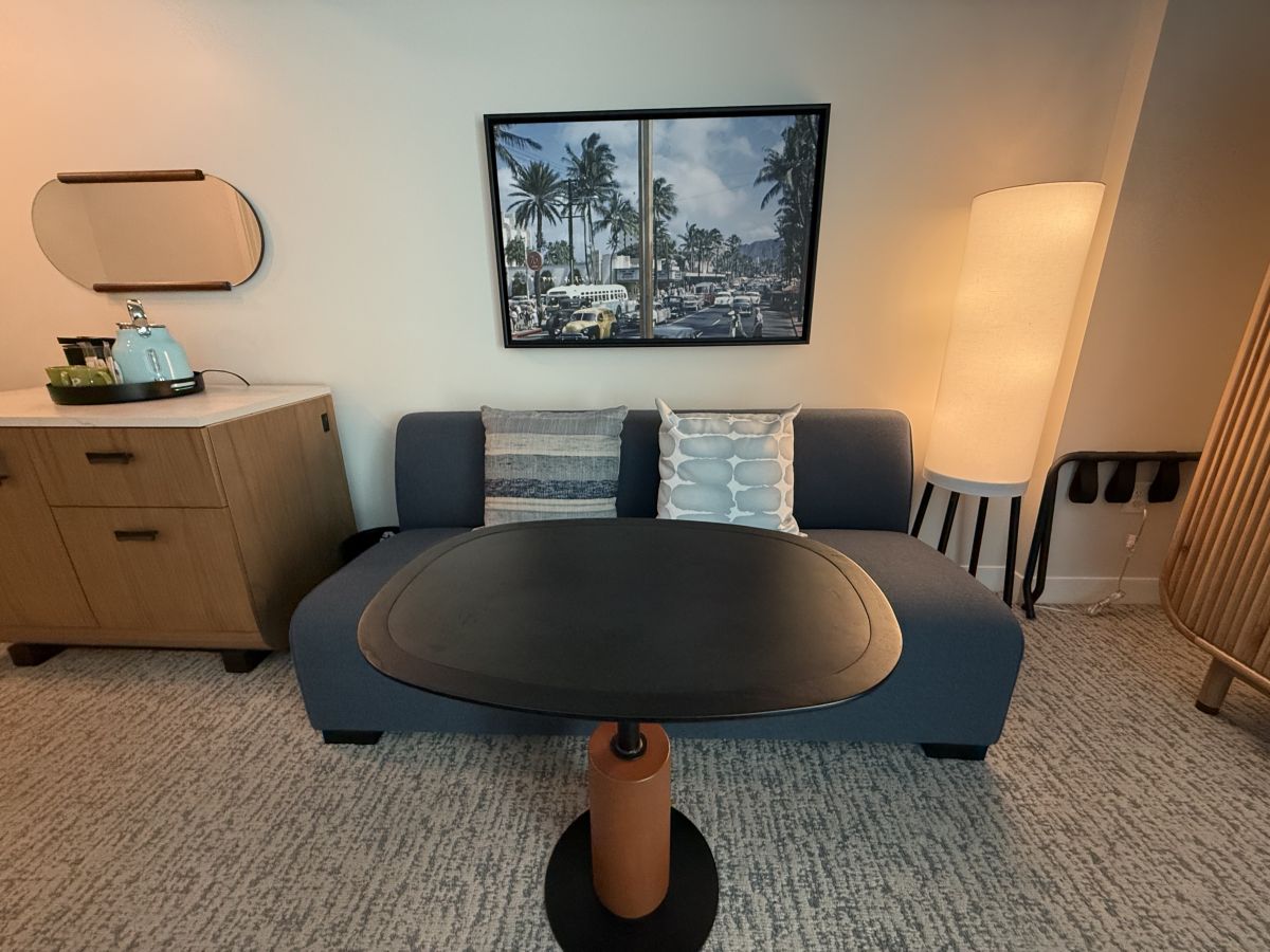 室内には、どこか懐かしさを感じさせるハワイの風景が飾られ、落ち着いた雰囲気を演出。さらに、ソファーが備わっているため、お茶を楽しんだり、パソコン作業やガイドブックを読む際にも重宝しますよ。
