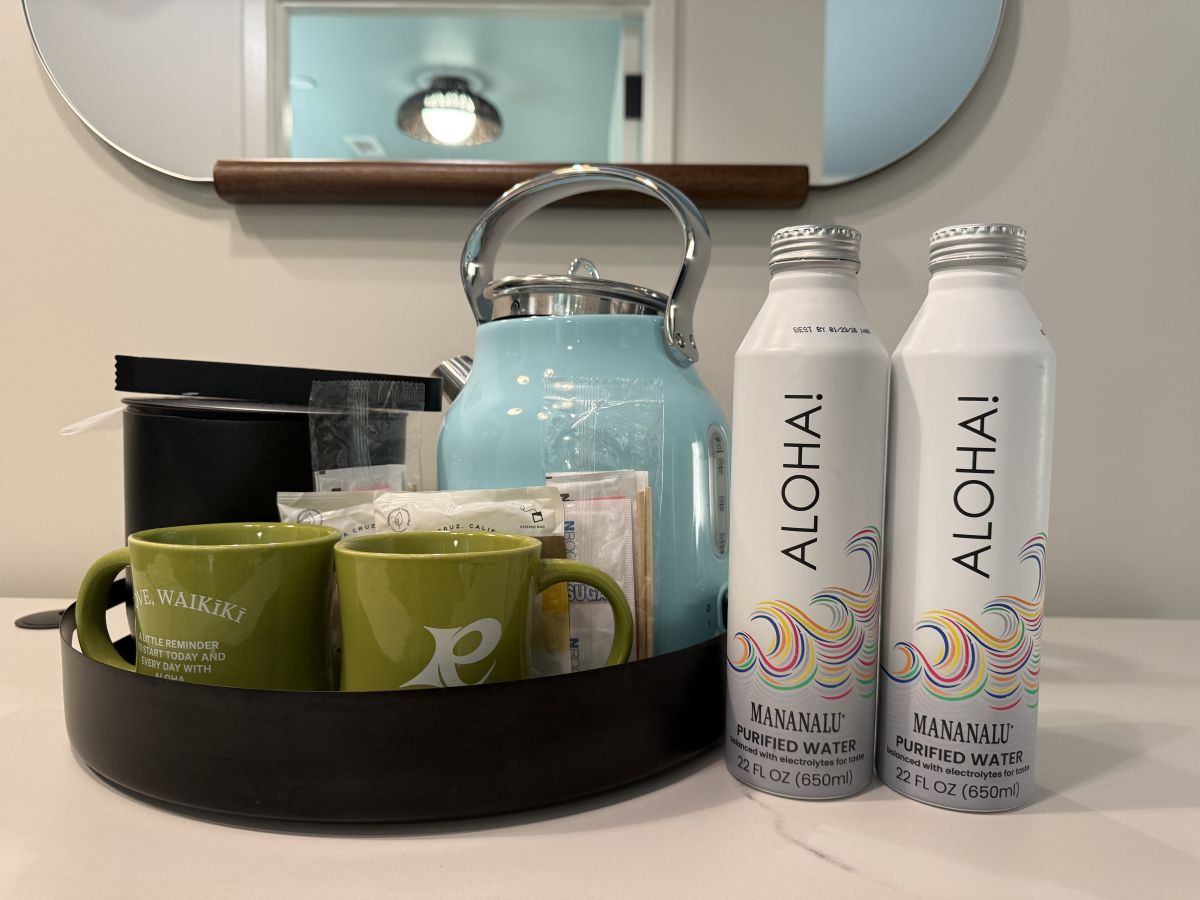 アメニティには、可愛らしくちょっとレトロなライトブルーのポットと、「スティープドコーヒー」というティーバッグ型のコーヒーがセットされています。また、100%アルミニウム製で再利用可能な「ALOHA!」のロゴが印象的なウォーターボトルが2本用意されており、見た目のデザイン性も抜群で可愛いですよね。