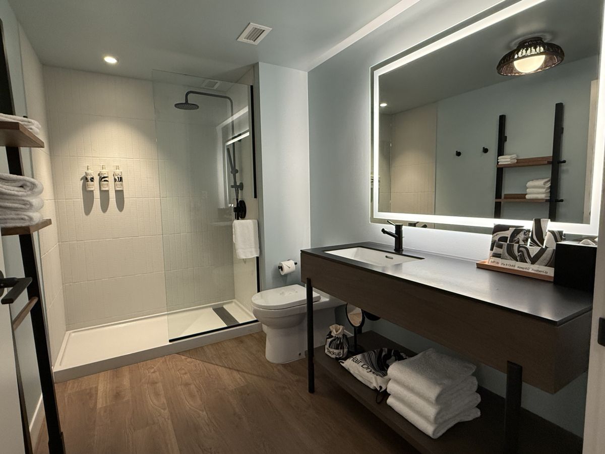 特に注目したいのがバスルーム! その広さは他のホテルと比較しても際立っており、とてもモダンで清潔感があります。さらに、大きなハリウッドミラーが空間を明るく見せ、広々とした印象を与えています。