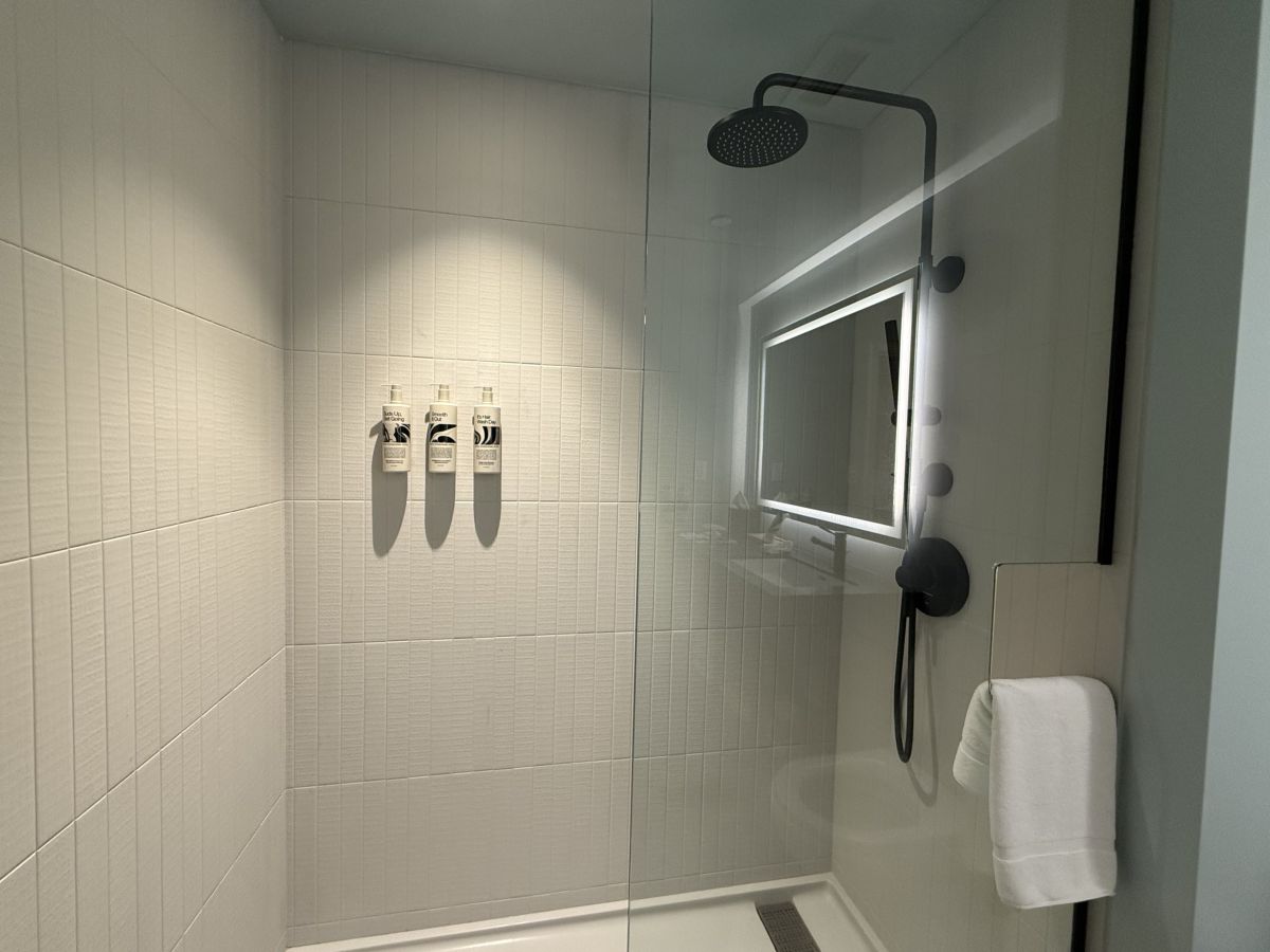 シャワー設備には、レインシャワーとハンドシャワーの両方が完備されています。特筆すべきポイントは、シャワー横に設置された小窓のような開口部です。この開口部を通じてシャワーの操作が可能で、誤ってレインシャワーの水を浴びてしまったり、冷水がかかってしまったりする心配がありません。こんな開口部があるシャワールームは他ではあまり見かけず、とても機能的で便利な設計です。