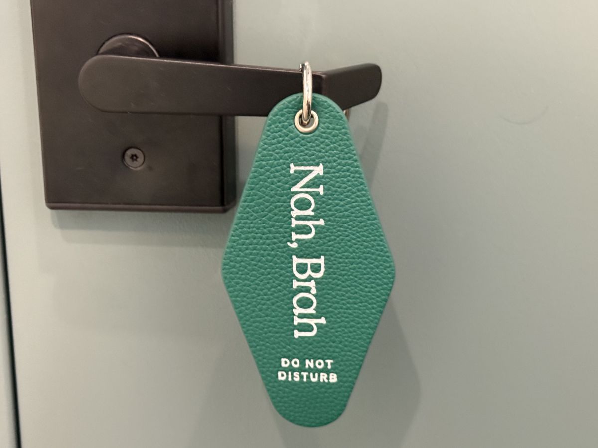 ドアノブに掛けるためのフックには、ピジン英語で「Nah, Brah」と書かれており、「起こさないで」という意味のフレーズがデザインされています。とてもおしゃれなフックです。
