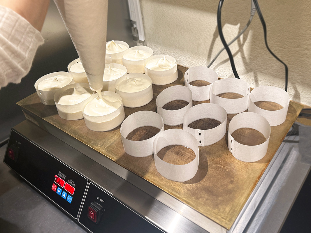 低温で片面8〜9分ほどずつじっくりと焼き上げたら、スフレ生地の完成。初めは高さ4cmほどですが、焼き上がる頃には7cmほどに膨らむのだとか。