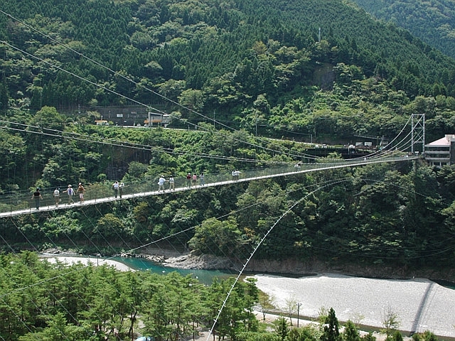昭和29年(1954)に完成した「谷瀬の吊り橋(たにぜのつりばし)」は、十津川に架かる上野地地区と対岸の谷瀬地区とを結ぶ大吊橋。全長297.7m、川面からの高さは54mあります。水量のわりに極端に広い河原は明治の大水害の名残りです。