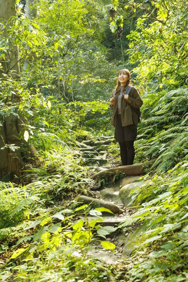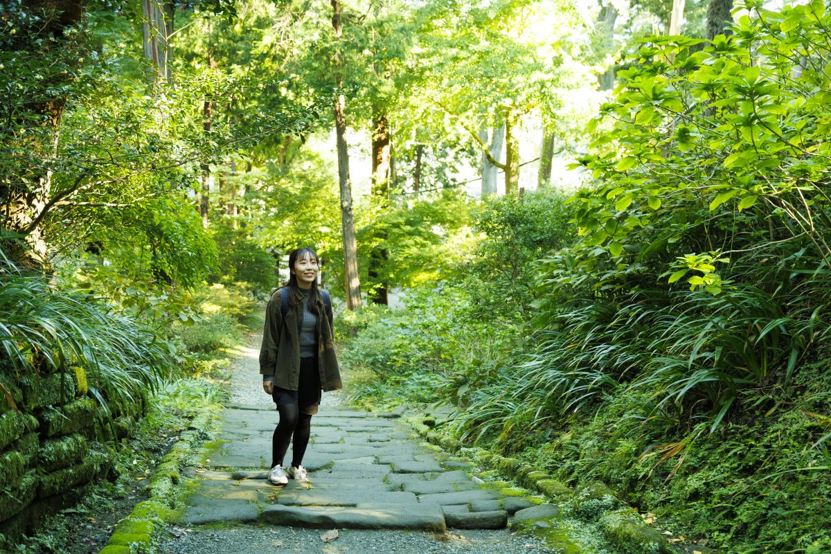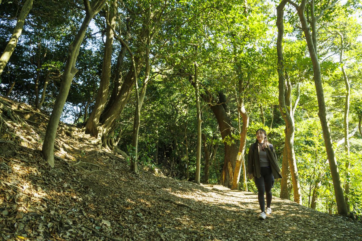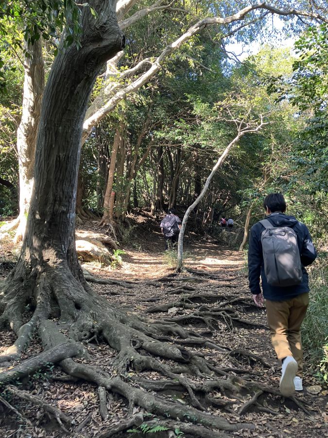 すぐそばには寺社や住宅街があったとは思えないほど、うっそうと木々が生い茂っていました。登れば登るほど道は広く、木々の隙間から光が差し込むようになり、心地良い景色が広がっていきます。辺りは静かで最高にリフレッシュ! 木の根が張り巡っているので、足元には気をつけてくださいね。雨の日は滑りやすくなるので、要注意です。