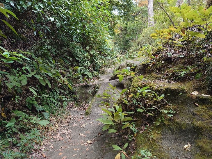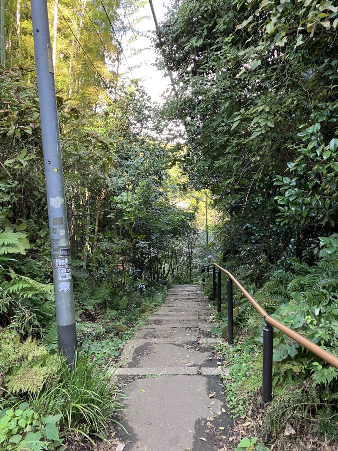 浄智寺を後にし、裏山の方へ進むと階段があります。階段は舗装されており、手すりもあるので登りやすくなっています。