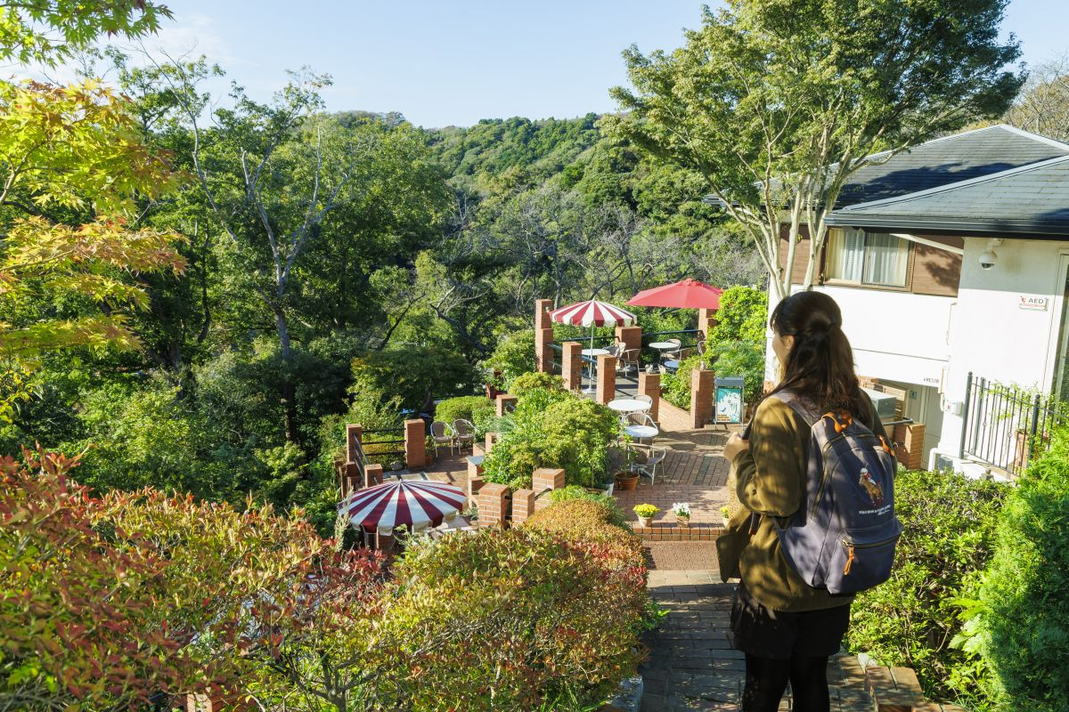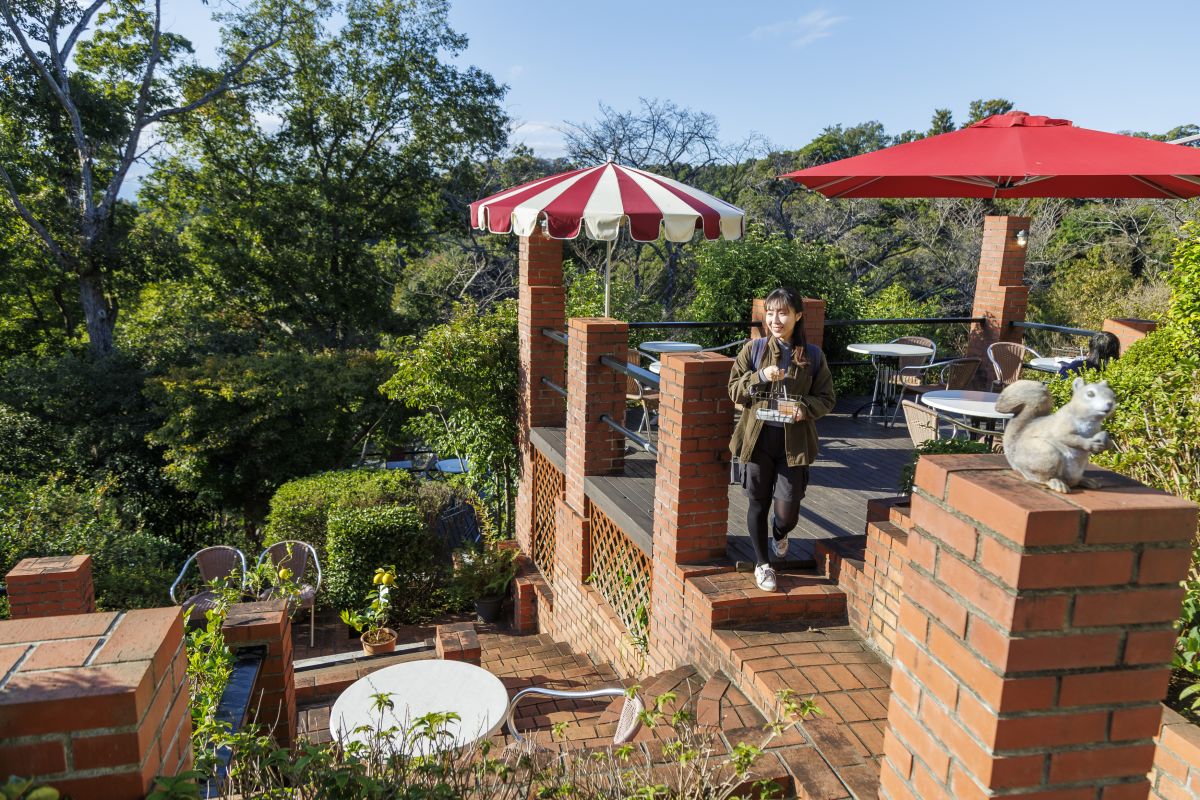 ゴールである高徳院を目指す途中に天空テラスとよばれるカフェがあります。ハイキングコースを歩いていると突然現れるレンガ調のメルヘンなカフェ。不思議な世界に迷い込んだような気分になりました。ここ樹ガーデンは、もともと別荘だった建物を、付近を通るハイカー向けの休憩所として約40年前にオープン。地形に沿って設けられたテラス席では、非現実的な空気感や抜群の眺望を楽しむことができます♪