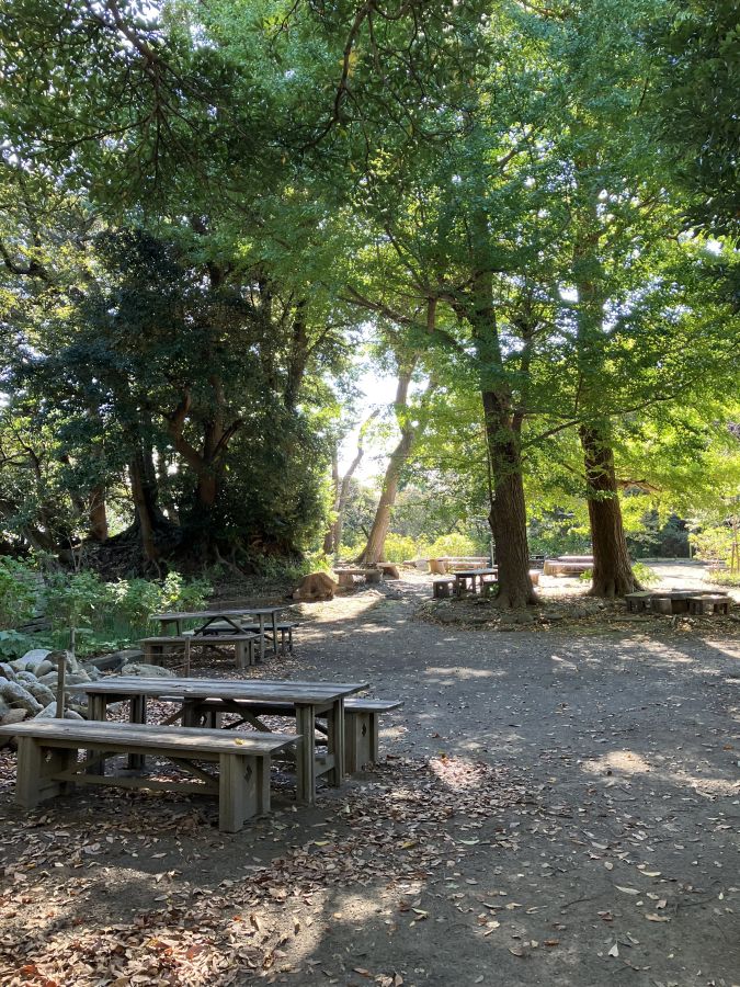 浄智寺から徒歩20分ほどで、葛原岡神社の境内にあるこもれび広場に到着しました。ひとまずここで休憩です。日差しをたっぷりと浴びられる開けたスポットなので、居心地抜群です。ベンチやテーブルがたくさんあり、自動販売機などもあるので、ピクニックにも最適です♪道中に安心して休憩できるスポットが用意されているのが、このハイキングコースの推しポイントです。