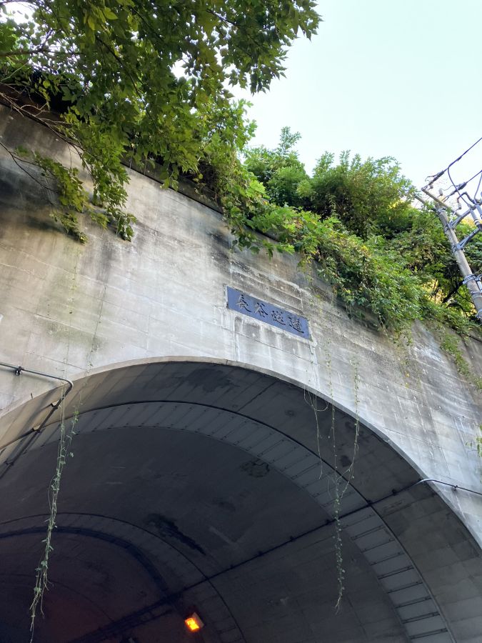 長谷隧道からハイキングコースを眺めた写真です。上部の緑の部分にハイキングコースが通っています。こんなところを歩いていたとは…! 驚きです。