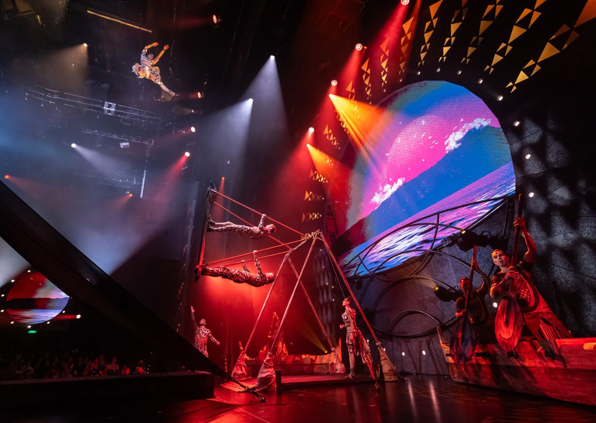 「シルク・ドゥ・ソレイユ アウアナ」は、ハワイの文化や伝説を描いた8つの章で構成されています。その壮大な物語は、ポリネシアの人々がハワイの島々へ移住する様子を描いた空中ブランコのアクロバットからはじまります。