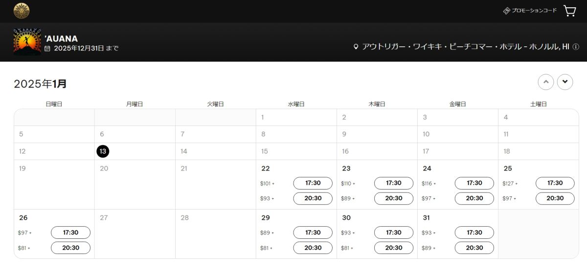 次のページで日時を選択します。2025年1月現在は、月・火曜日を除く毎日17時30分〜19時、20時30分~22時の2ショーが開催されています。