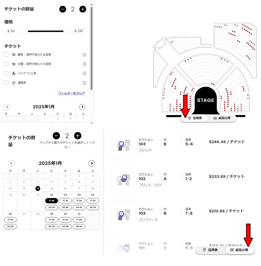 最後に座席を選択し、お支払いへと進みます。シーティングは「座席表(写真上)」もしくは「最高の席(写真下)」のいずれかから検索することができます。ハワイでしか観ることができない「シルク・ドゥ・ソレイユ アウアナ」をご堪能あれ。