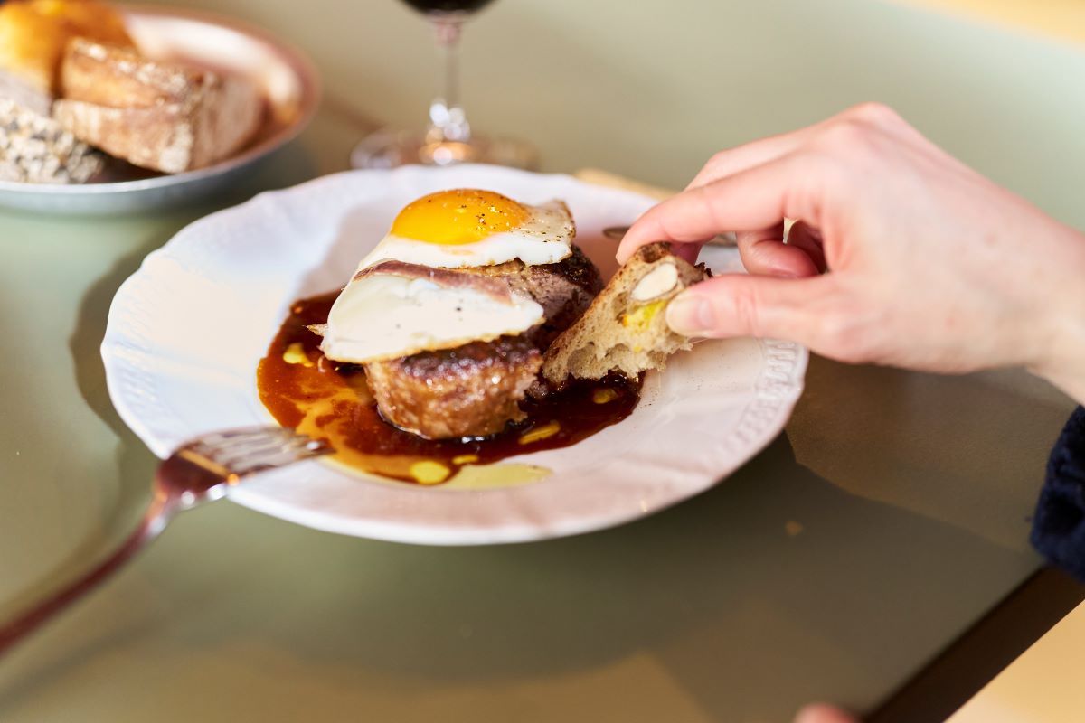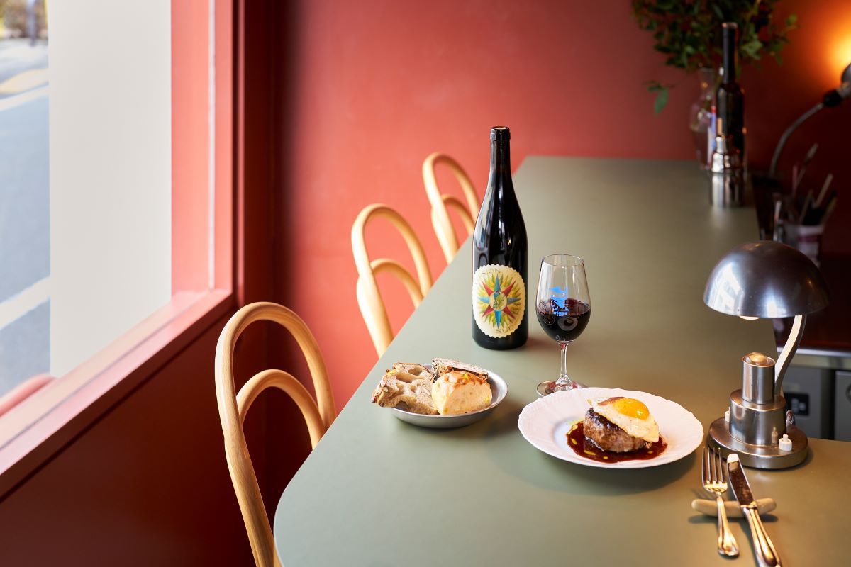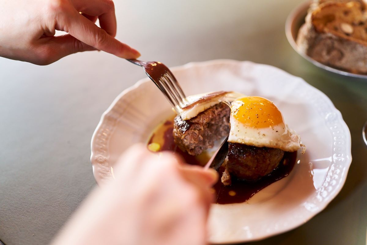 さらに、パン飲みの幸福度を高めてくれるのが、フレンチベースの小皿料理。ワインはもちろん、パンと一緒に食べることを前提に考えられたメニュー構成になっています。シェフが市場に買い出しに行った際、食材からインスピレーションを得てその日のメニューが決まることもあるのだとか。行くたびに新しい味に出合える楽しみがありますね。今回は、看板メニューの「蝦夷鹿の自家製ハンバーグとアンチョビ」をオーダーしました。