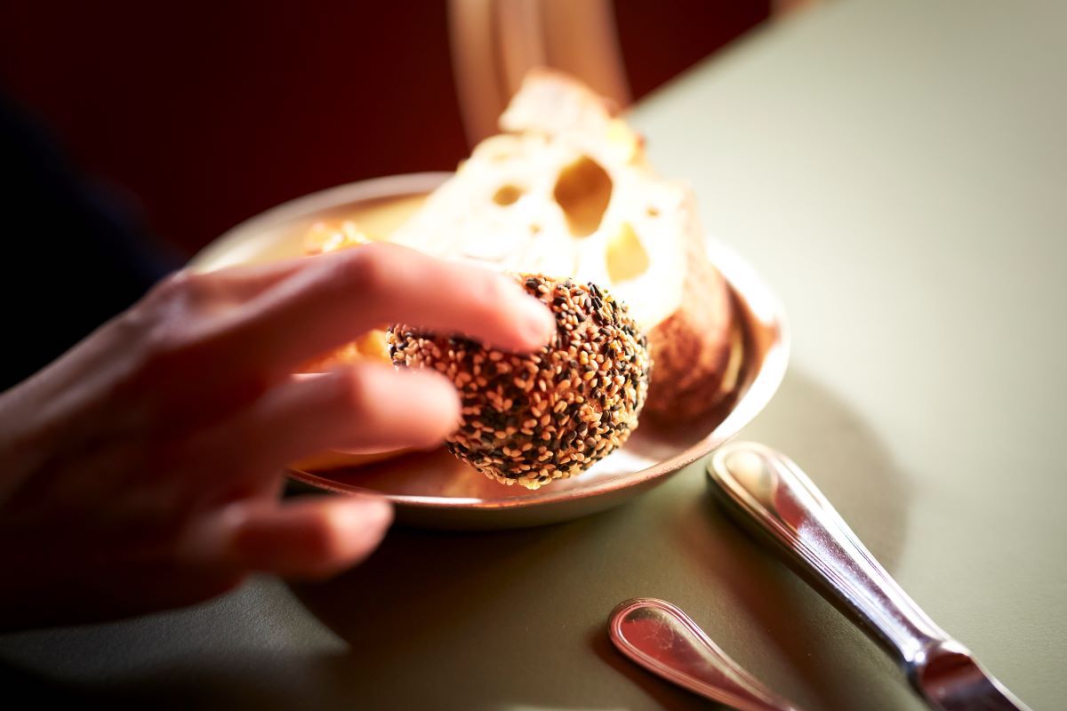 「マルコナアーモンド・オレンジ・カルダモンのカンパーニュ」のパンをソースにつけて食べてみます。ふわっと広がるカルダモンの香りとオレンジの清涼感、コクのあるソースにアーモンドの食感も相まって、たまらないおいしさ! 食材の掛け合わせで楽しませることが好きなシェフのアイデアが光っています。