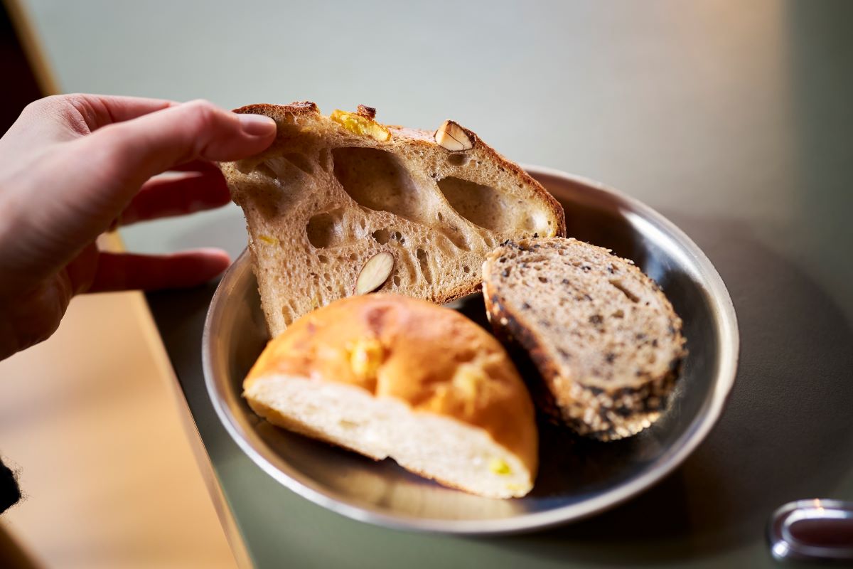 こちらが取材時ひと皿目の「パン盛り合わせ」。1回に3種類のパンが提供されます。ハード系のもの、フワフワのもの、フルーツが入ったものなど、味も食感もさまざまなパンが盛り合わせになっていて、何度もおかわりしたくなってしまいます。最初は食事に合わせて、食事が終わったらおつまみになる塩気のあるパンをメインにと、お客さんの食べ具合を見てパンを選んでくれているのだそう。
