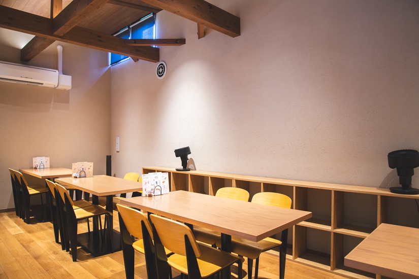 店内はログハウス調の内装ですが、太い木の柱や梁が使われているため古都らしさも満点。中は2階建てになっていて、天井が高く開放的な雰囲気なのも特徴です。1階は入って右手がショップ、左手と2階がカフェスペースになっています。