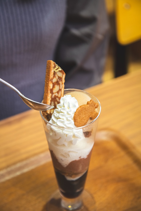 「クルミッ子パフェ」は、下にコーヒージュレとチョコレートムースが入っており、ビターな風味がキャラメルの濃厚な甘さにマッチ。塩キャラメルアイスとミルクアイスが添えられており、クリーミーな風味と塩気が複雑な味わいを生み出しています。一番上には「クルミッ子」をトッピング。さらに層の間にクルミとサブレのパウダーが入ることで、「クルミッ子」独特の風味をパフェとして再構築しています。