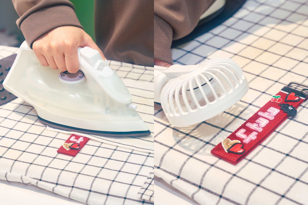 ベースアイテムとワッペンが決まったら、店員さんにバトンタッチ。配置の微調整の時間もしっかり取ってくれるので、こだわりをもって作り上げられますよ。しっかりアイロンを当てて、扇風機で乾かしたら完成。ものの5分ほどで仕上がります。