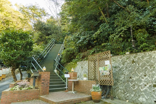 看板の先にはレンガ積みの入口があり、豊かに茂る木々の中に階段が続いています。道路から様子をうかがうことができるのは、階段の序盤のみ。先を想像できないことが、逆にワクワク感を掻き立ててくれます。