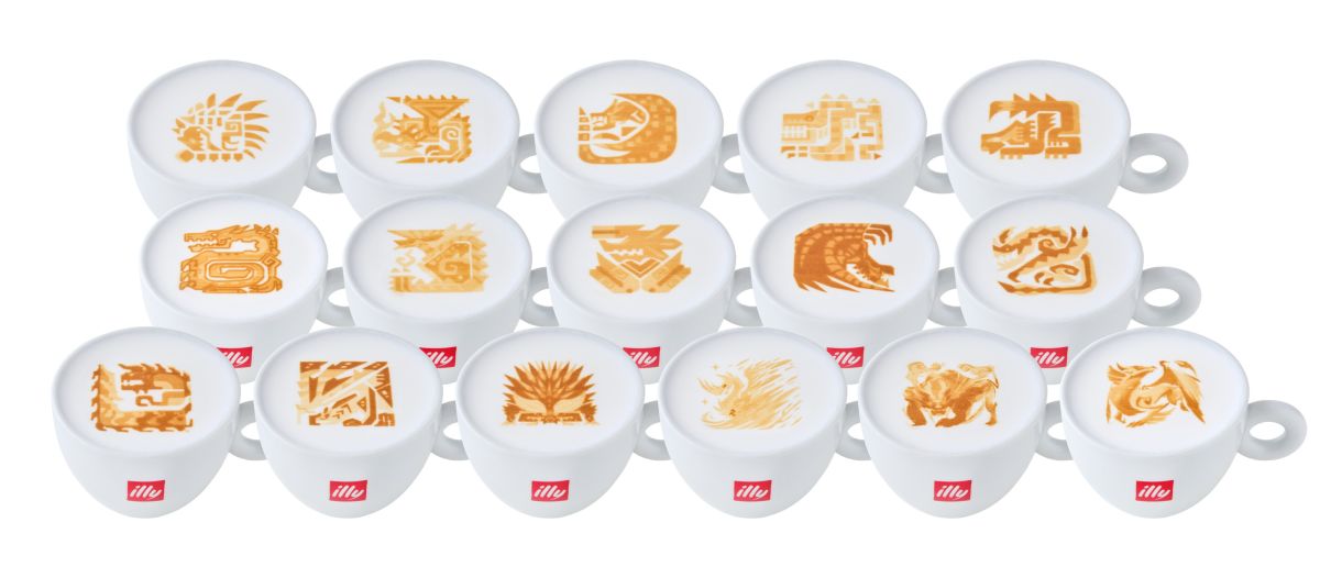 大狩猟展ARに登場する16体のメインモンスターのアイコンからデザインを選べるカプチーノ。イタリア・イリー社のエスプレッソ豆を使用した本格カプチーノをお気に入りモンスターと一緒に楽しんで!