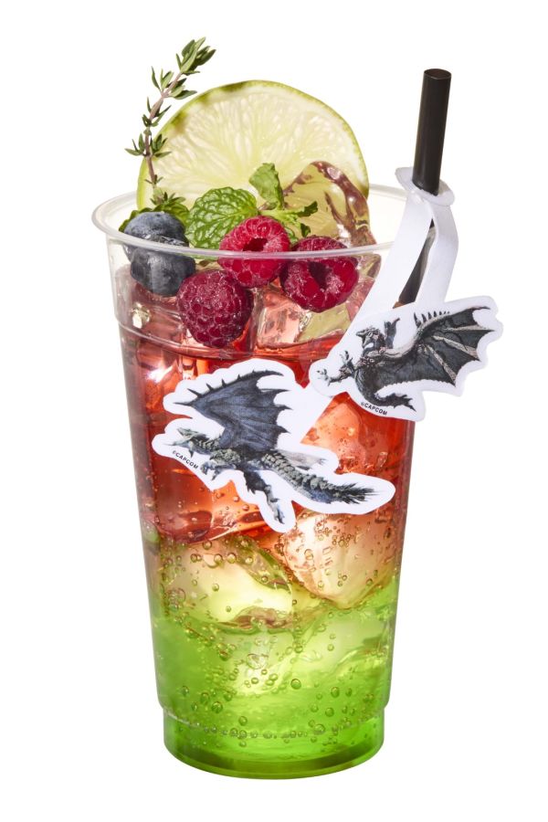 空の王リオレウスと陸の女王リオレイアを赤と緑のゼリーソーダと、トッピングのレッドラズベリーとライムで表現。レアアイテム「竜の涙」を連想させるブルーベリーが添えられています。