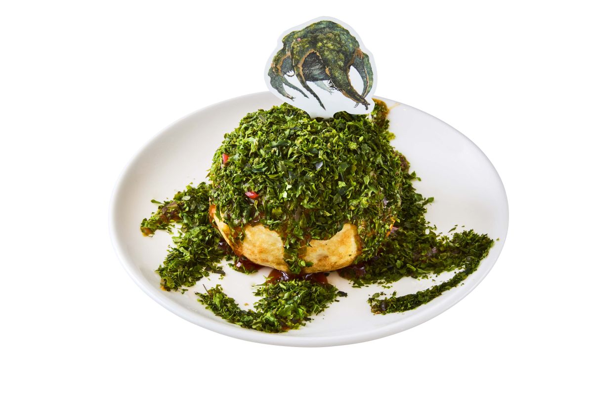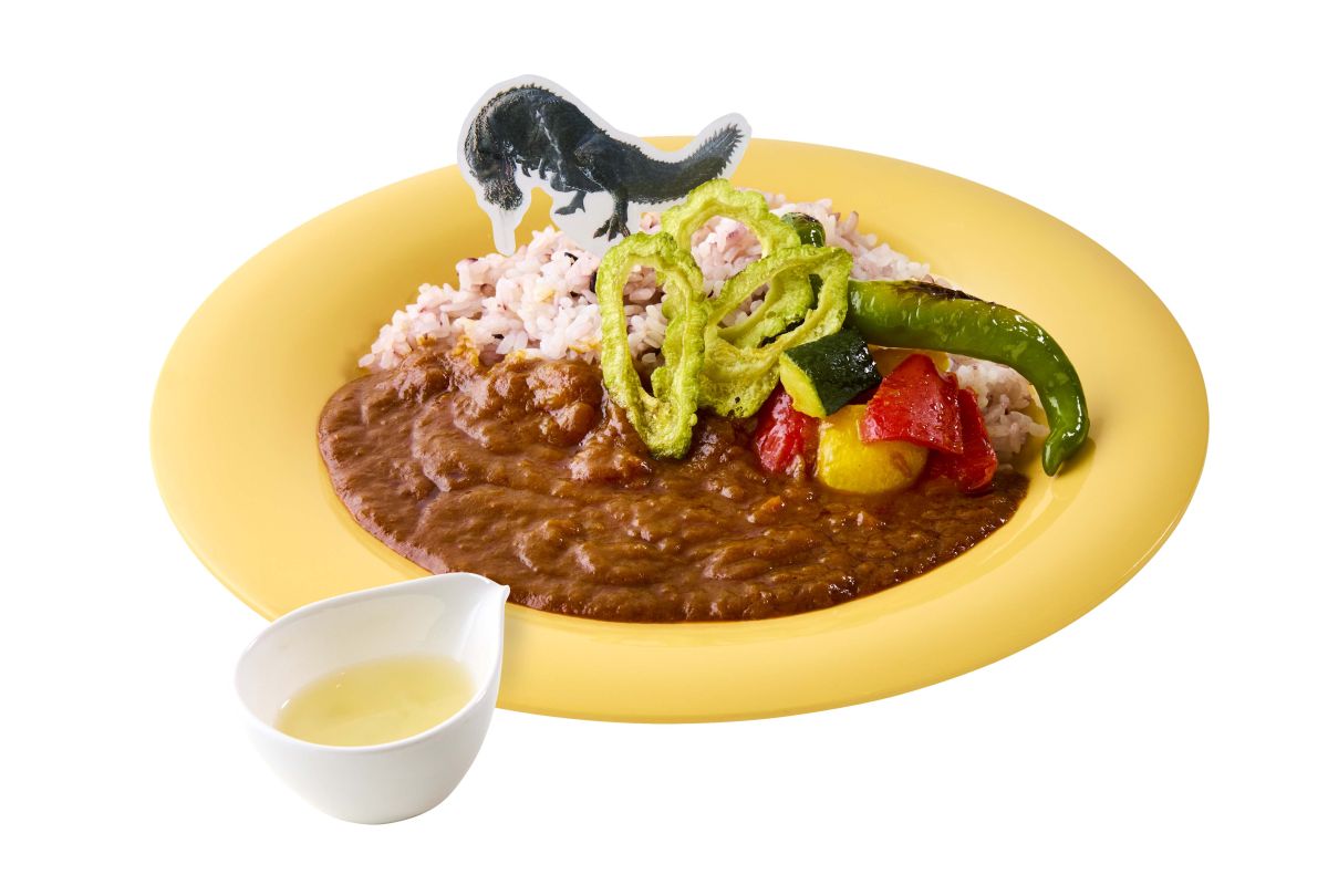 みんなのトラウマ、何でも喰らう雑食のイビルジョーを雑穀米カレーで表現。屈強な体を伏見唐辛子で、特徴的な口をゴーヤチップスで再現しました。お好みで滴る酸性のよだれ(レモンソース)をかけて召し上がれ!