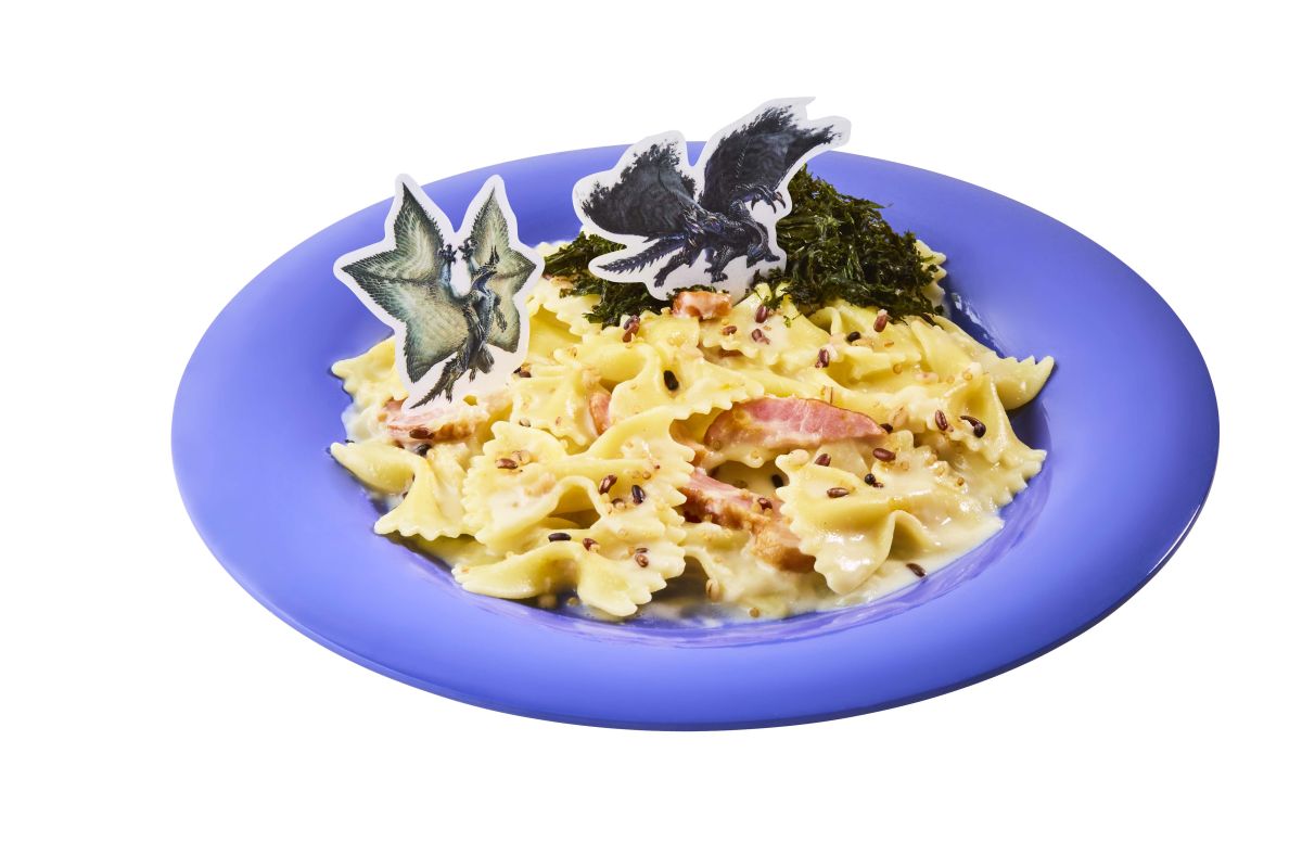 ゴア・マガラとシャガルマガラ、2体のモンスターを1皿で楽しめる1品。ゴア・マガラの鱗粉を紫のりで、シャガルマガラの翼をファルファッレで表現。紫のりとカルボナーラソースは相性抜群です。