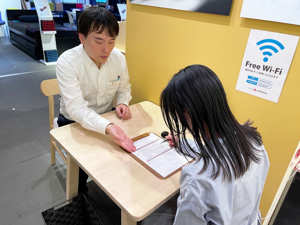 カルテに記入しつつカウンセリング。「スリープマスター」が、寝るときの姿勢は仰向けなのか横向きなのかや、今使用しているマットレスについてなど、質問の答えをひとつひとつ確認しながら相談に乗ってくれます。