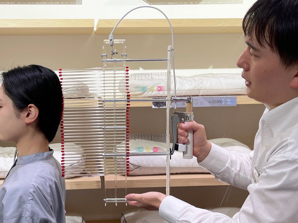 枕の高さを決めるため、プレスシェイパーという測定器で後頭部の高さと首のカーブを測定。自然に立った姿勢が理想的な寝姿勢なので、立ったまま行います。10秒もかからずあっという間に計測してもらえました。
