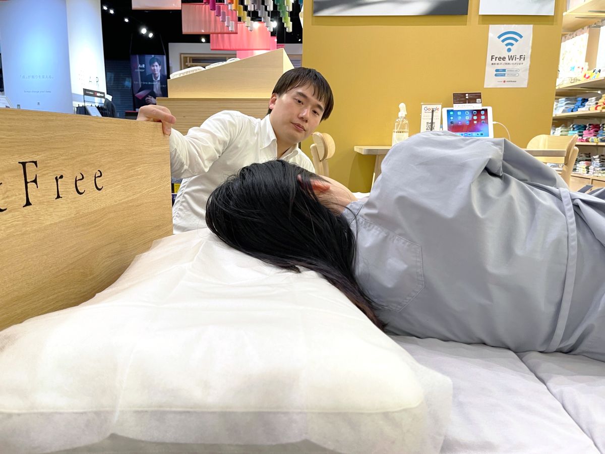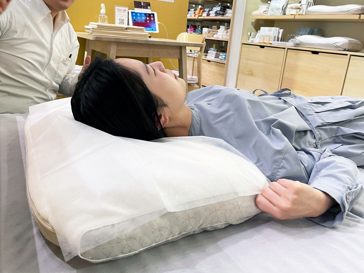 実はここ数年しっくりくる枕が見つからず、枕なしで寝ているので、横向きの際に肩が痛いことがあることなど、睡眠にまつわる悩みをじっくり聞いてもらえました。