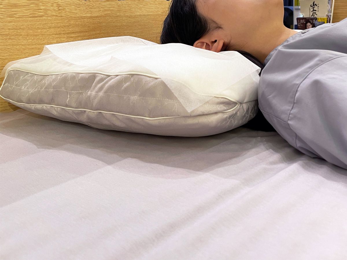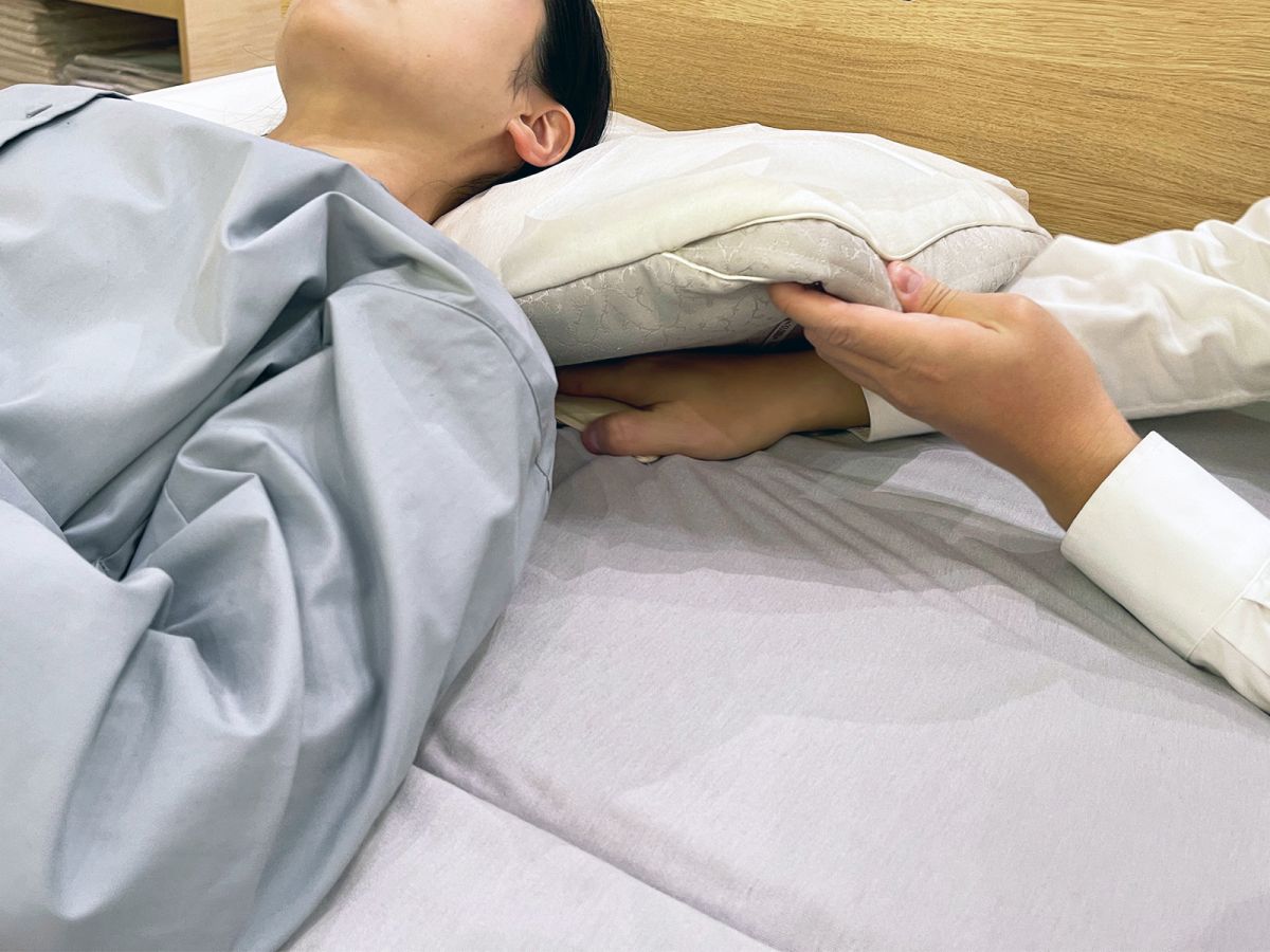 寝返りがしやすいよう、枕の横部分の高さを調節します。枕が高すぎて頭がのらず、寝返りがしにくくなると睡眠の妨げになるので、左右ともにしっかり調整してもらいます。