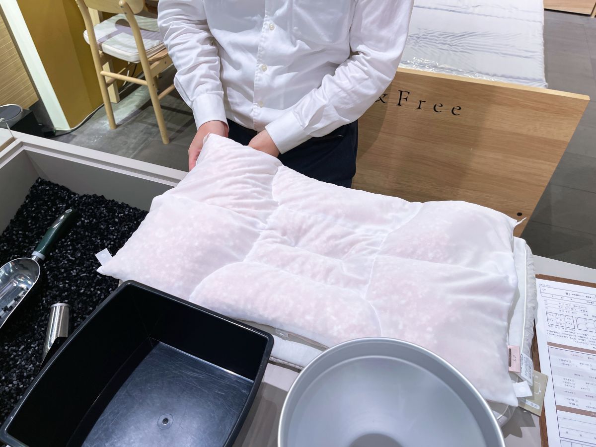 枕はその場ですぐに仕立ててもらえます。枕は3層式で、1層目に自分が選んだ素材、2層目にミニ備長炭パイプ、3層目にウレタンシートが入る構造です。