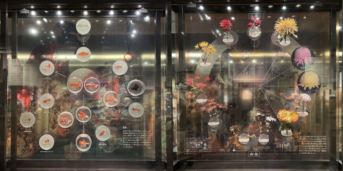 日本の金魚や菊の系統などを表した展示もおすすめです。この鮮やかな金魚やお花は、江戸時代からある品種なのだとか!