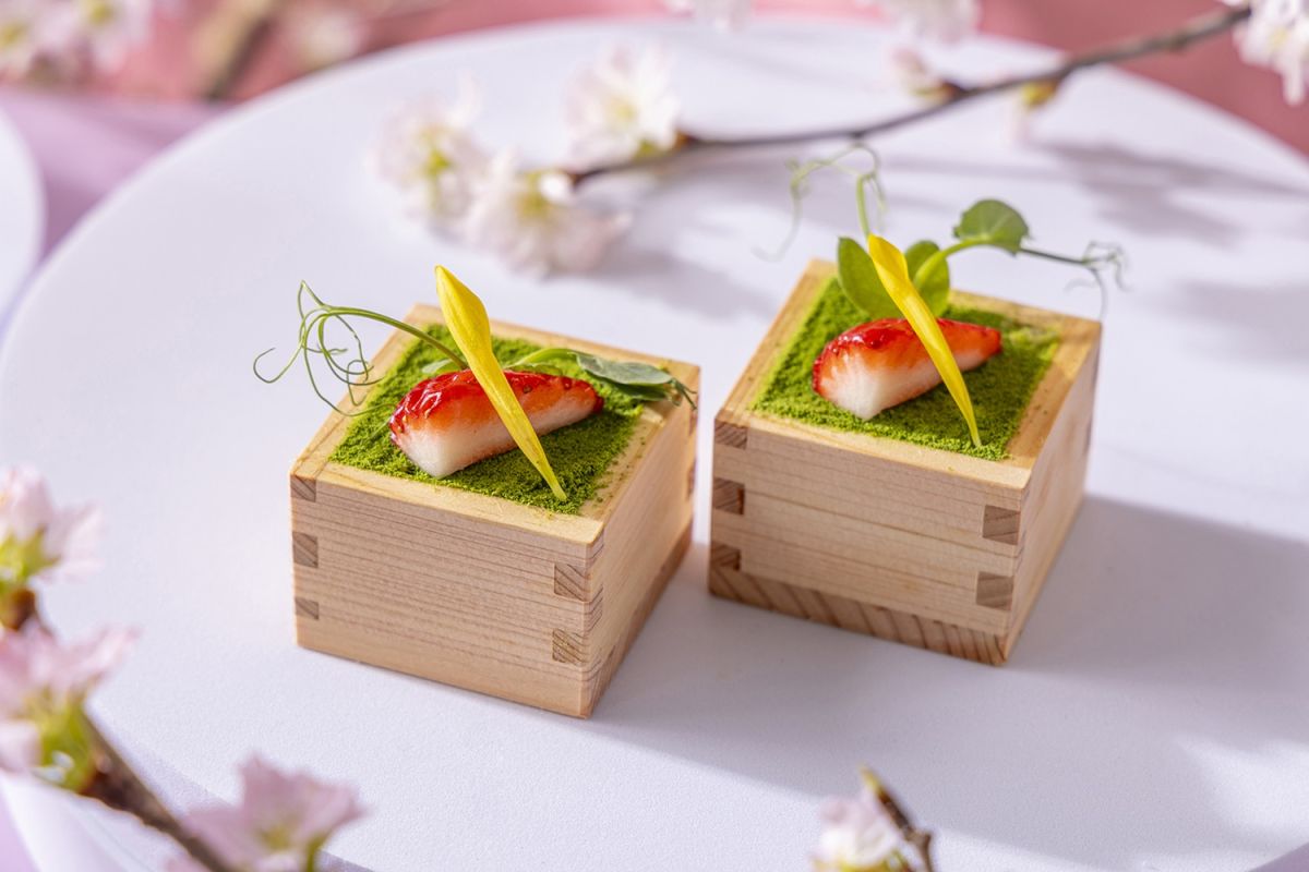 そして注目は、「コンラッド東京」が2025年7月1日に開業20周年を迎えることを機に新登場したスタンドで提供される、「デラックスアフタヌーンティー」。乾杯のシャンパーニュに加え、このプラン限定で提供される2種のフレッシュイチゴ、そしてピンク色の飴菓子で桜の木に見立てた「桜ソイ・ティラミス」を楽しめます。